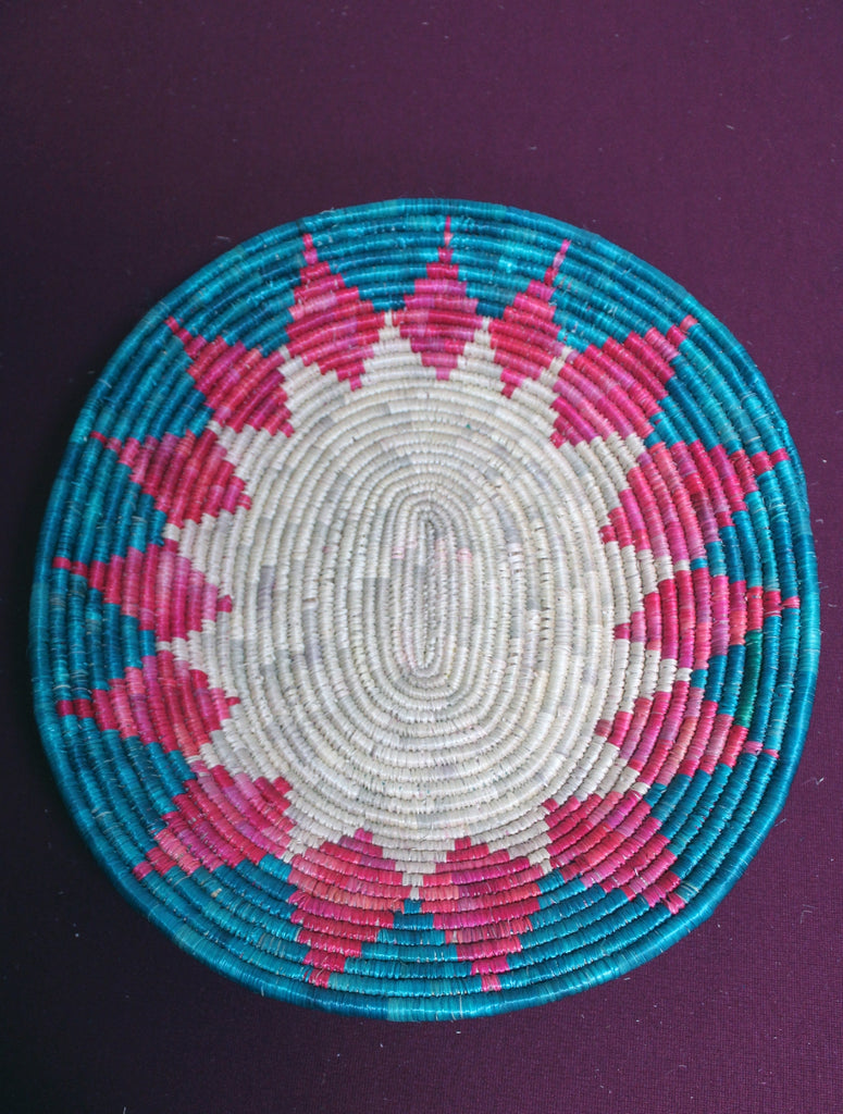 Description: Handwoven Basket    Red, Blue, Natural  - Oval
