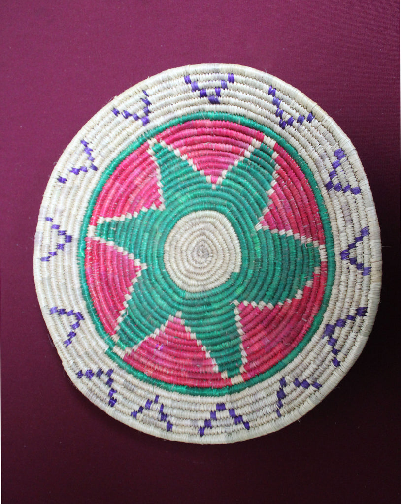 Description: Handwoven Basket Red, Green, Purple, Natural - Round