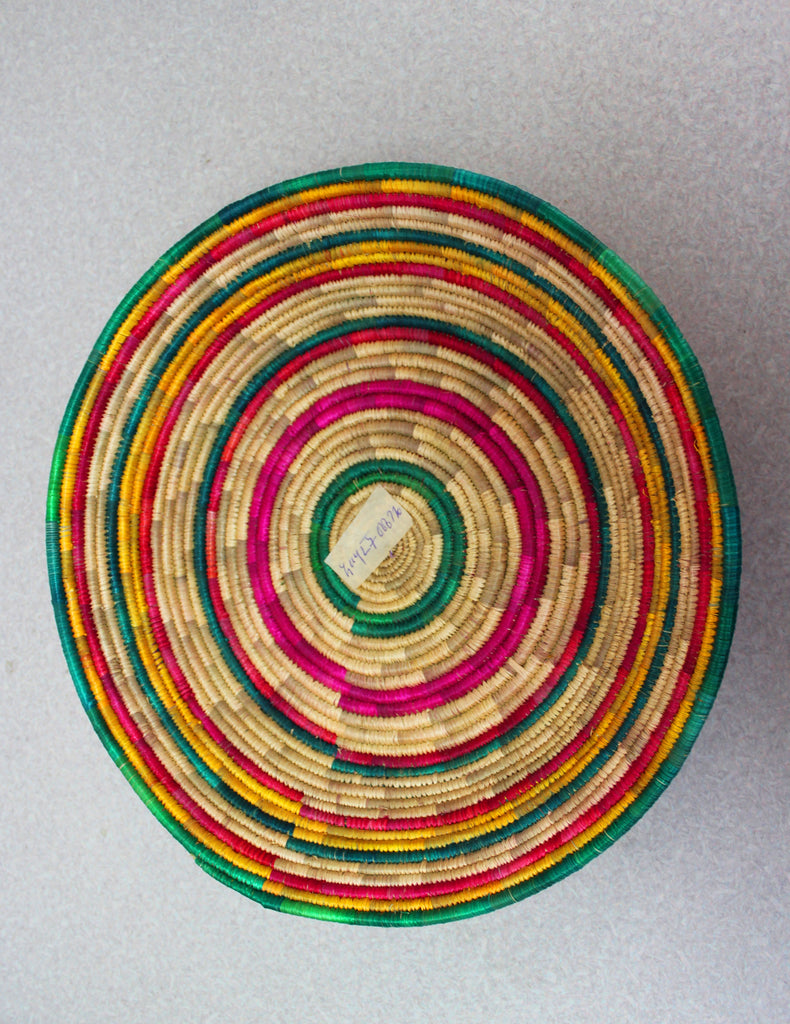 Description: Handwoven Basket Red, Pink, Yellow, Green - Round