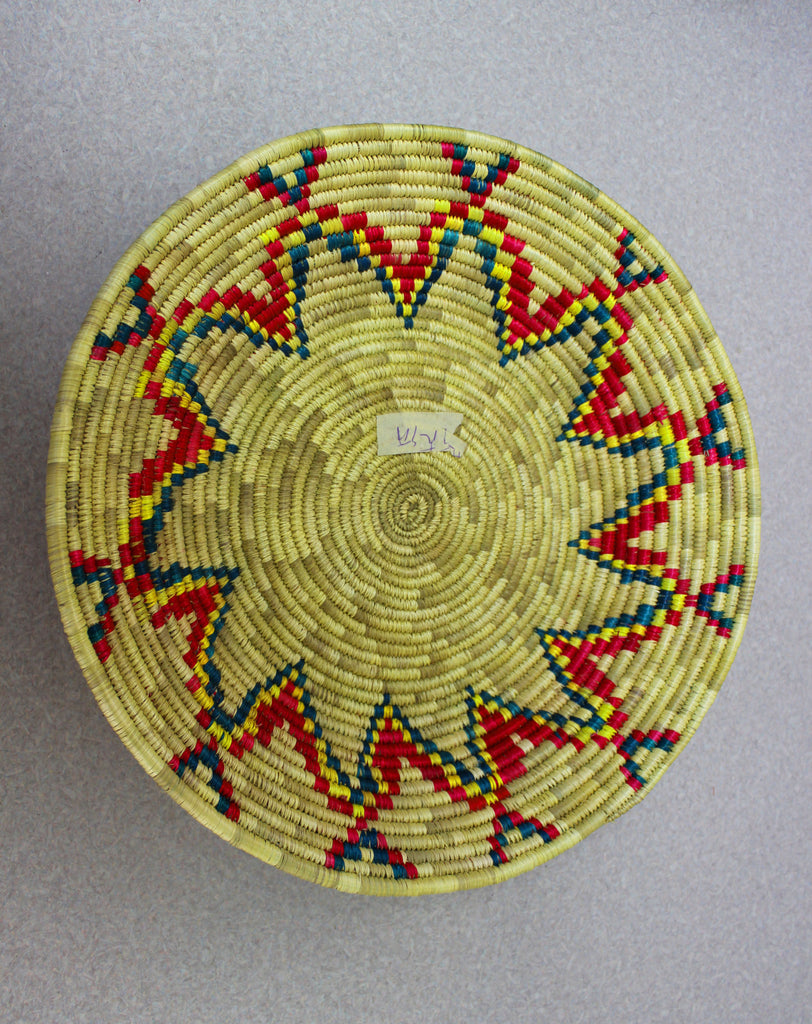 Description: Handwoven Basket Pink, Purple, Yellow, Green, Natural - Round