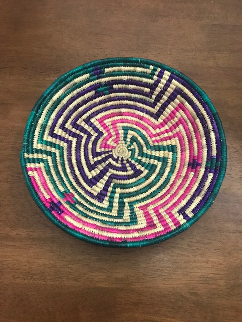 Description: Handwoven Basket - Purple, Pink, Blue, Natural - Round