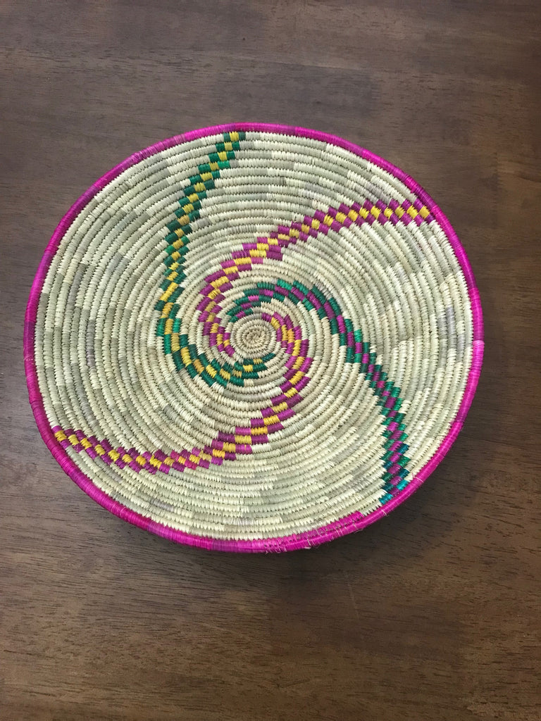 Description: Handwoven Basket - Purple, Green, Blue, Natural, Yellow - Round