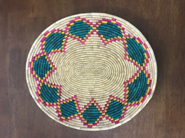 Description: Handwoven Basket - Pink, Blue, Natural, Yellow - Oval
