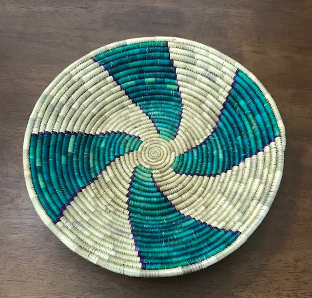 Description: Handwoven Basket - Purple, Blue, Natural - Round