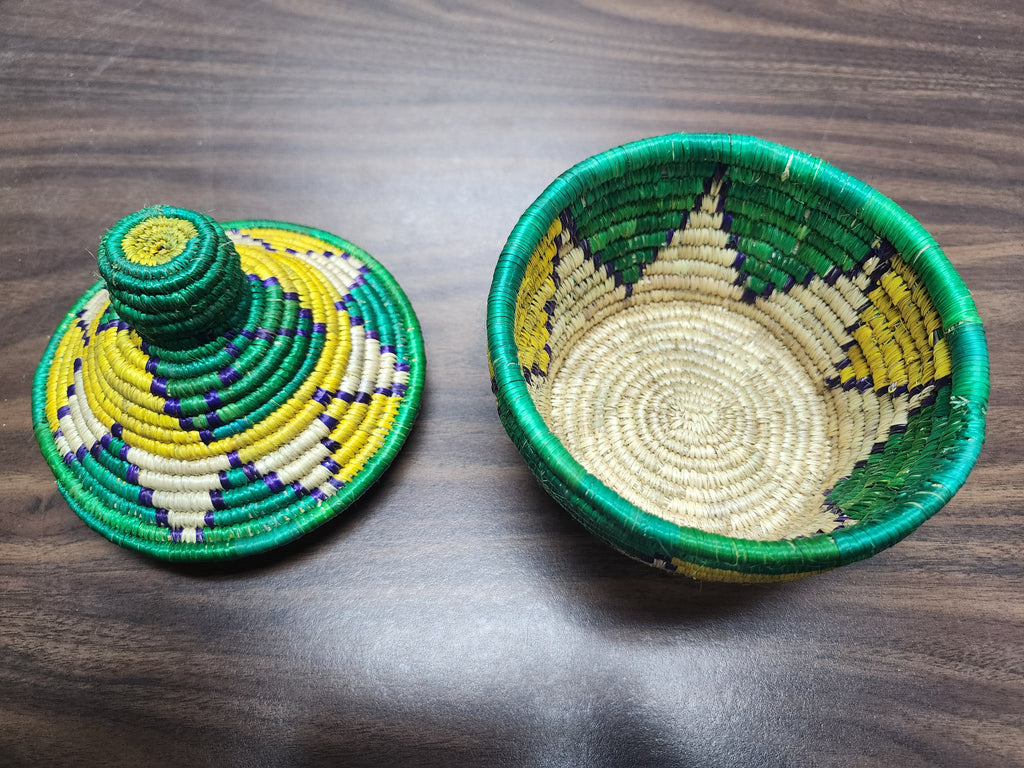 Description: Handwoven Basket with Lid - Purple, Green, Natural, Yellow - Round