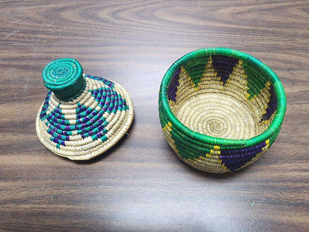 Description: Handwoven Basket with Lid - Purple, Green, Blue, Natural, Yellow - Round